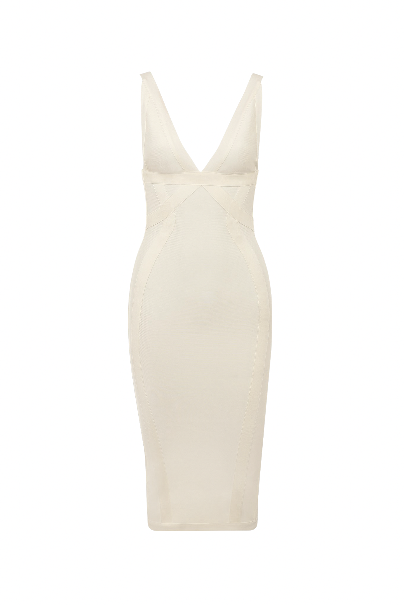 Abito midi bandage in spandex strutturato dal fit aderente. Scollo profondo a V con spalline larghe, costruzione a pannelli sagomati che scolpiscono la silhouette e valorizzano punto vita e fianchi, cerniera sul retro.